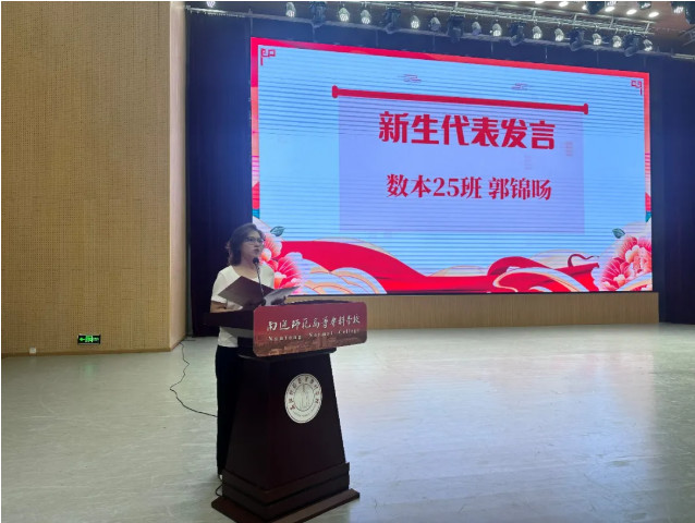 新⽣代表数本25班郭锦旸同学上台发⾔,分享初⼊通师⾼专的感悟与决⼼,代表广大新生表达了从今天起,将以通师⾼专学⼦的身份,在这⽚充满希望的⼟地上耕耘梦想。