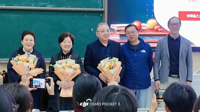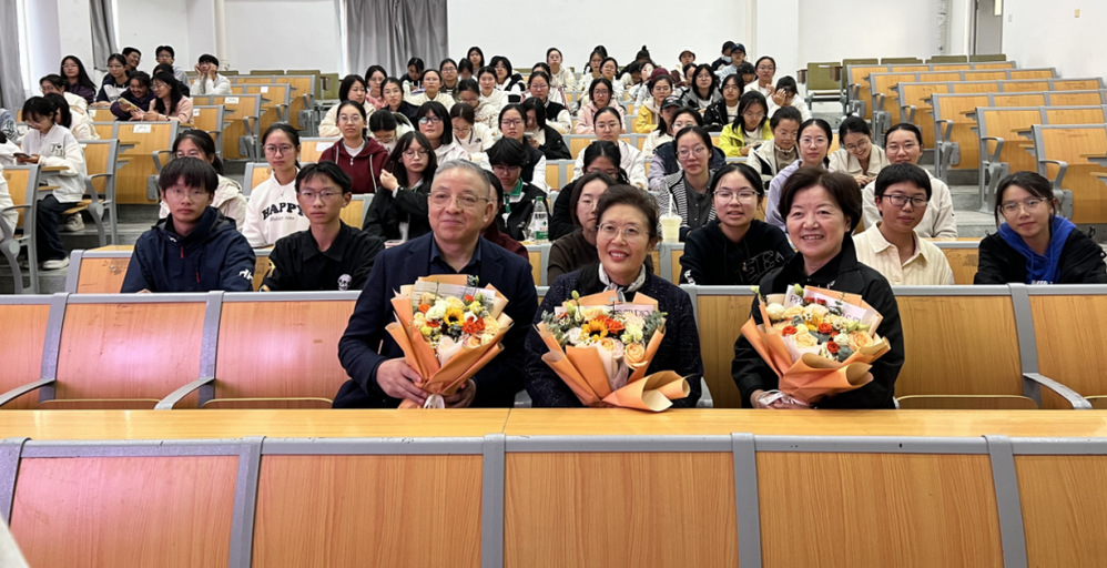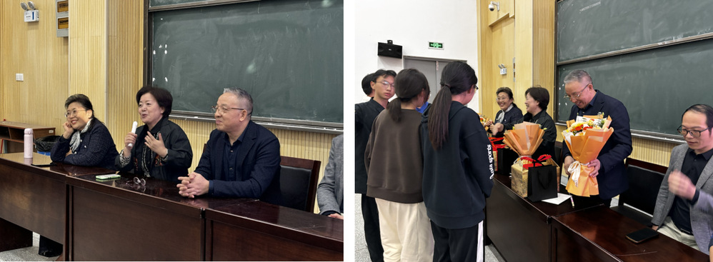 活动尾声,学生代表向三位老师和两位与会的书记献上了鲜花与重阳节糕点,致以节日的祝福,并向老前辈们“莫道桑榆晚,为霞尚满天”的奉献精神表达了深深的敬意。