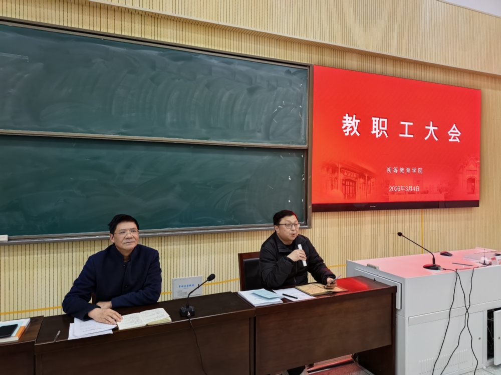 3月4日下午,初等教育学院召开新学期教职工会议。学院党总支书记汪薛松主持会议并传达岳峰校长工作报告精神,院长张建平对新学期学院工作作出具体部署,学院全体教职工参加会议。